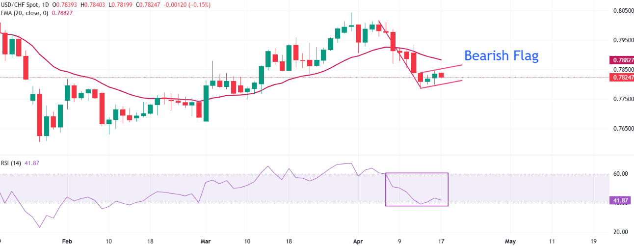 撰写本文时,美元兑瑞郎(USD/CHF)交易价格约为0.7825,因保持在20周期指数移动平均线(EMA)0.7883下方,短期走势仍偏空。在日线图上,该货币对呈现看跌旗形形态,暗示在经历一段盘整后,下行趋势或将延续。