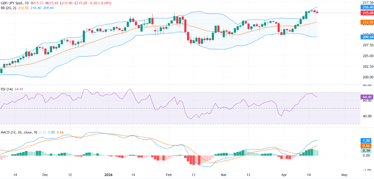 GBP/JPY 在周五的交易中呈现温和的下行倾向,市场环境相对平静,日元表现略优于英镑,因市场对美伊潜在和平协议的预期升温,导致油价承压。截稿时,该货币对交投于215.05附近,较日内高点215.69有所回落。