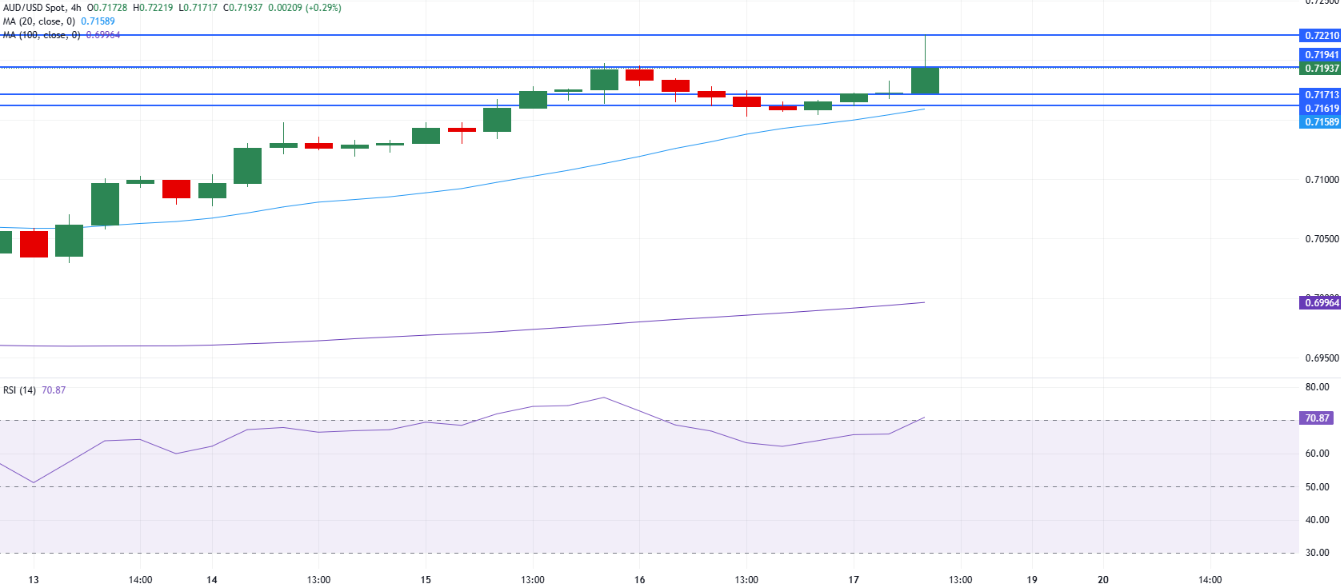 在4小时图上,澳元兑美元交易于0.7194。由于价格保持在20周期简单移动平均线(SMA)0.7159和长期100周期SMA 0.6996上方,该货币对维持短期看涨倾向,整体上行趋势结构保持完整。当前关注焦点在于价格在0.7194枢轴点附近的表现,而相对强弱指数(14)徘徊在70上方,暗示上行动能虽已拉伸但仍具建设性,而非明确的反转信号。