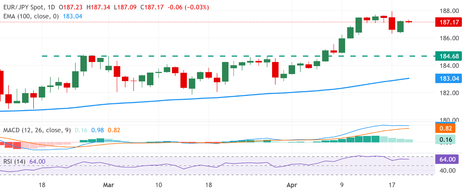 日本央行然而,由于进口能源成本给通胀前景蒙上阴影,日本央行预计将在6月发出加息信号。此外,市场猜测日本当局将出手遏制日元进一步走弱,这抑制了日元空头的激进押注。除此之外,美元(USD)的温和上涨被视为对欧元构成压力,这限制了欧元/日元交叉盘的上行空间。欧元/日元近期突破185.00这一心理关口,加之汇价多次从100日指数移动平均线(EMA)反弹,这有利于欧元/日元多头。此外,移动平均收敛发散指标(MACD)处于正值区域,其柱状图仍呈积极态势。此外,相对强弱指数(RSI)徘徊在64左右,暗示买盘强劲但尚未达到极端水平。