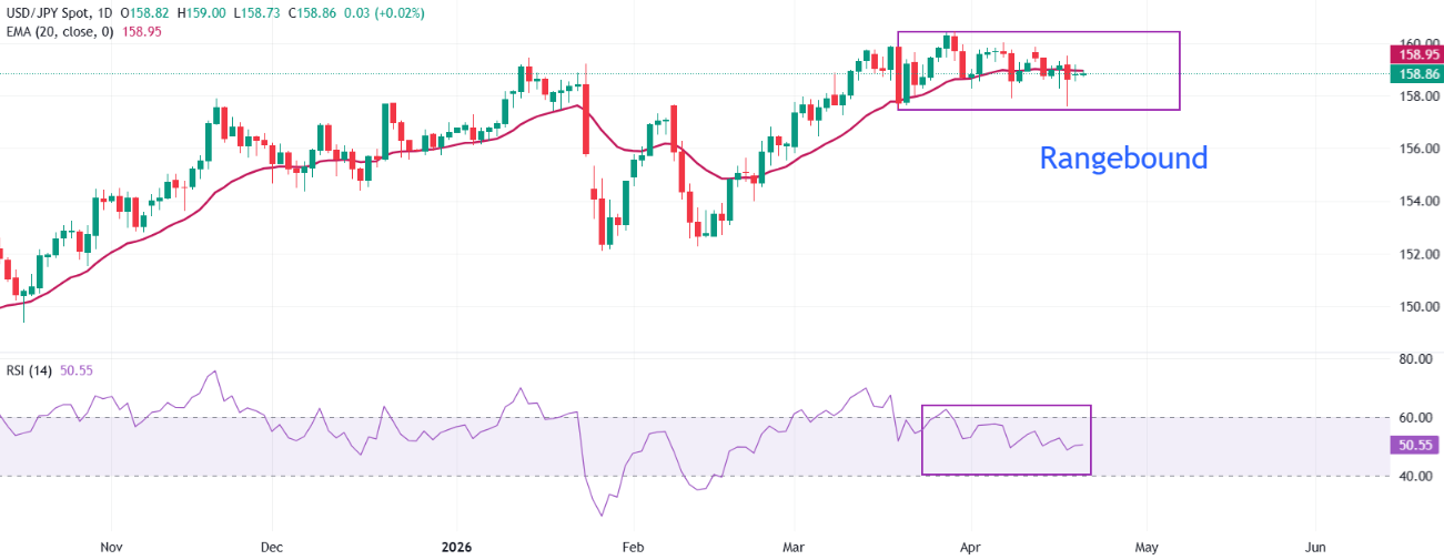发稿时,美元兑日元在159.00附近持平交易。价格已在一个多月的时间里徘徊在20日指数移动平均线(EMA)158.95附近,表明市场处于盘整趋势。