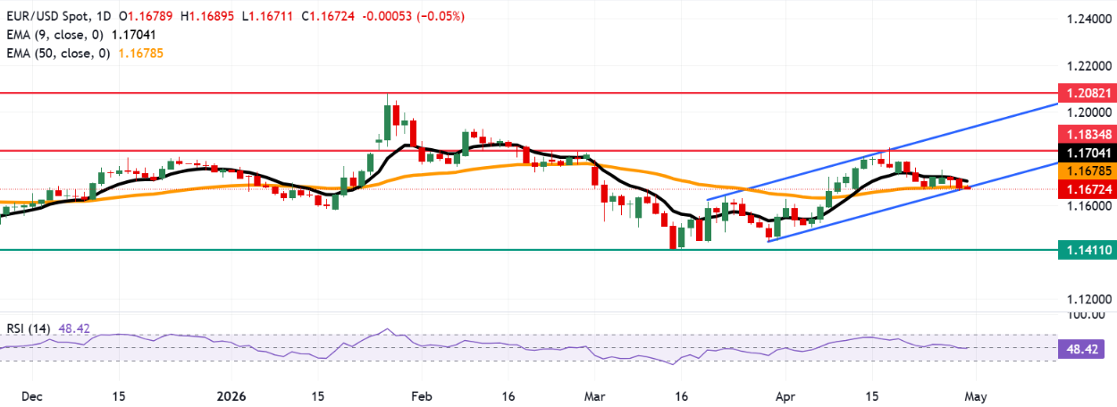 欧元/美元连续第三天扩大损失,在周四的亚洲时段交易于1.1660附近。日线图技术分析显示,由于该货币对已跌破上升通道,存在看跌反转的可能。