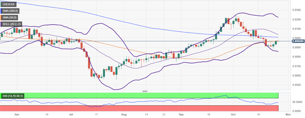 该货币在过去三个交易日中有两个交易日上涨,周涨幅为 0.50%,尽管买家希望重新获得控制权,但他们必须清除当前汇率上方的关键阻力位。首先是 50 日均线 0.8972,然后是 200 日均线 0.9007。如果美元/瑞郎跌破 10 月 12 日高点 0.9088,美元/瑞郎将触及 0.9100。