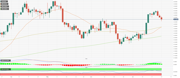 根据日线图,XAG/美元的技术前景短期看跌,因为指标在前几个交易日遭受重创。然而,交易者应关注 20 日和 100 日简单移动平均线 (SMA) 走势,因为它们即将在 23.75 美元区域形成看涨交叉,这可能为灰色金属提供重要支撑。