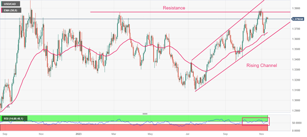 美元/加元在美联储主席杰罗姆·鲍威尔对利率的鹰派指引推动下大幅反弹后徘徊在整数阻力位1.3800附近。由于对美联储可能进一步加息持谨慎态度,市场情绪转向规避风险,加元资产目标稳定在 1.3800 以上。