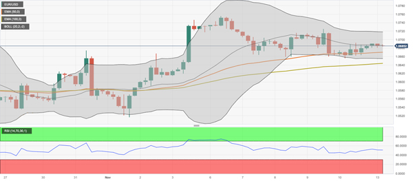周一亚洲时段,欧元/美元在 1.0700 关口下方窄幅波动。交易员更愿意在欧元区第三季度国内生产总值(Q3)公布之前观望。欧元区季度增长率预计将收缩 0.1%,年度增长率预计将增长 0.1%。疲软的报告可能会给欧元带来压力,并成为该货币对的阻力。主要货币对目前交投于 1.0685 附近,全天持平。