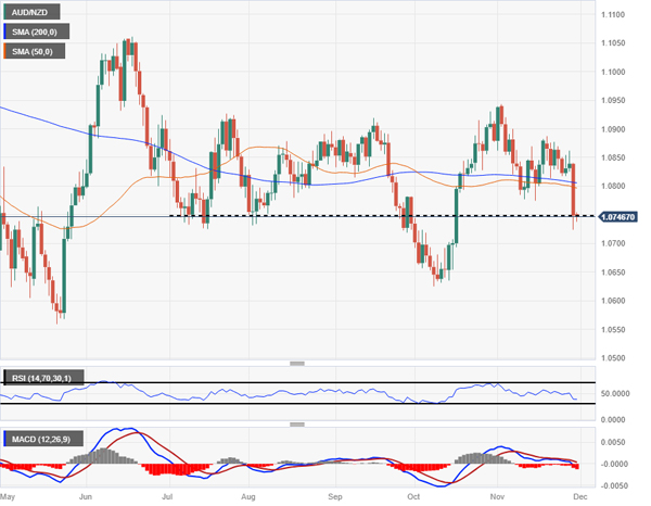 澳元(澳元)已直接滑过 1.0800 关口附近的 50 日和 200 日简单移动平均线(SMA),兑纽元(新西兰元)下跌,在最后一个波动低点 1.0780 的南侧进行交易。每日烛台。