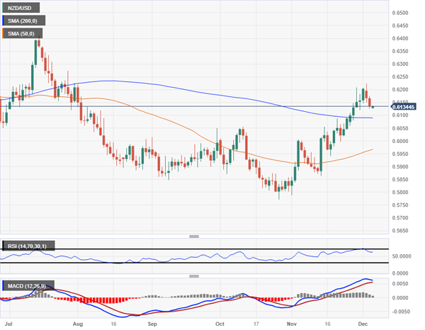 每日烛台显示,新西兰元/美元将确认看跌回调至略低于 0.6100 的 200 日移动平均线,而周一略低于 0.6225 的四个月高点代表了近期买盘的最近技术上限。
