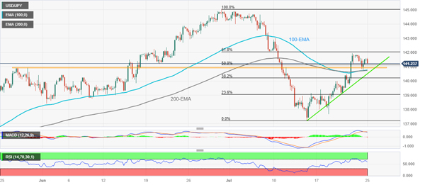 另一方面,最新峰值 141.95 以及该货币对 6 月 30 日至 7 月 14 日下行趋势的 61.8% 斐波那契回撤位(接近 142.05)可能会挑战美元/日元货币对的复苏走势。