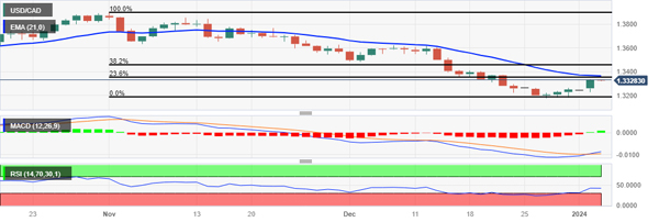 然而,滞后指标 14 天相对强弱指数 (RSI) 位于 50 以下。交易者可能会等待暗示美元/加元货币对可能改变方向的确认。
