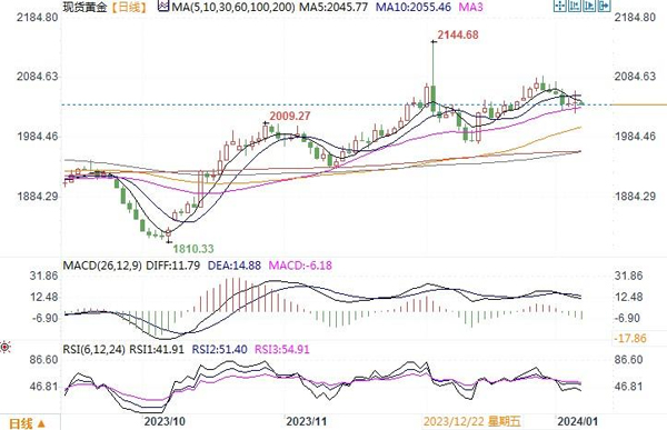 上周五(1月5日),因美国经济数据好坏参半,周五国际现货黄金盘中高低震荡幅度达1%,金价现跌后升,最低探至2024美元,最高触及2063美元,最终收盘价略有上涨,报收于2045.49美元水平。