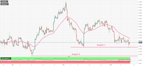 白银价格在自 12 月 13 日低点 22.51 美元绘制的水平支撑位附近发现了一些买盘兴趣。23.17 美元的 50 周期指数移动平均线 (EMA) 继续充当白银价格多头的障碍。如果该资产再次面临抛售,白银价格将跌至 11 月 13 日低点 21.88 美元。