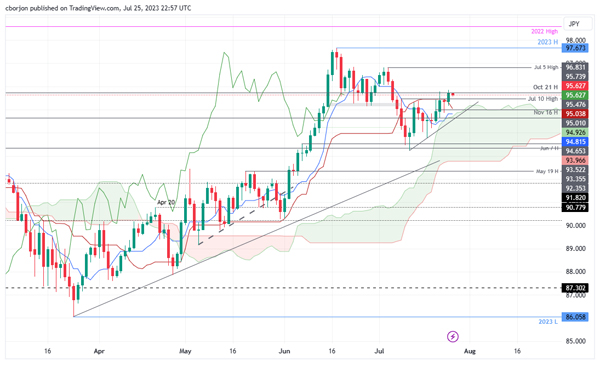 如果澳元/日元跌破 7 月 10 日高点 95.47,可能会加速跌向 Kijun-Sen 线 95.03,并可能跌破 95.00 关口。