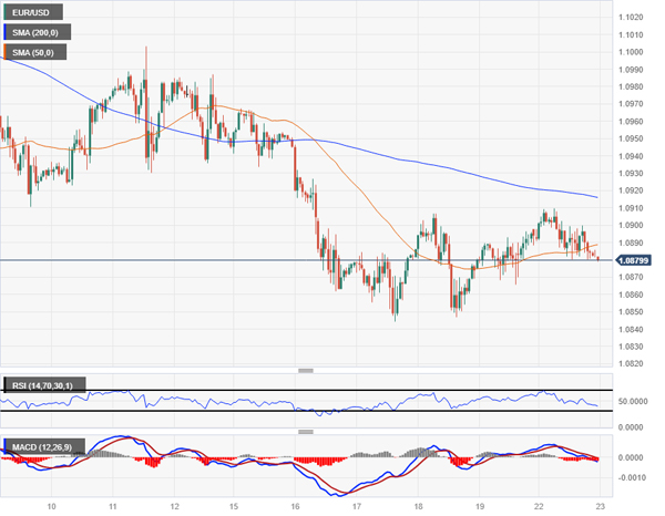 欧元/美元继续交投于200小时简单移动平均线(SMA)南端,在周一早些时候短暂测试该关口上方后跌至1.0900关口下方。