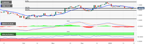 周四亚洲时段,欧元/美元走低至 1.0880 附近,因美元 (USD) 努力收复近期跌幅。欧元/美元货币对的 14 天相对强弱指数 (RSI) 位于 50 关口下方,表明市场有看跌势头。