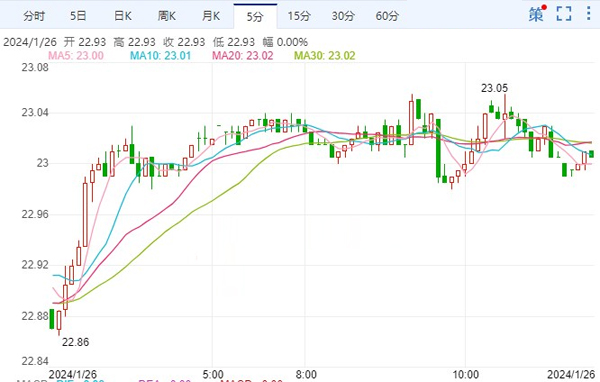 今日周五(1月26日)欧盘时段,COMEX白银目前交投于23.10美元/盎司一线下方,今日开盘于23.02美元/盎司,截至发稿,comex白银价格暂报22.93美元/盎司,下跌0.46%,最高触及23.05美元/盎司,最低下探22.98美元/盎司,目前来看,comex白银行情盘内短线偏向看跌走势。