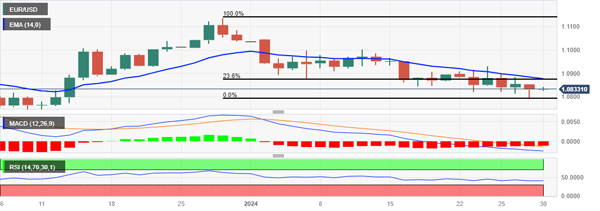 欧元/美元货币对的 14 天相对强弱指数 (RSI) 位于 50 关口下方,表明市场出现看跌势头。此外,移动平均收敛分歧(MACD)是一个滞后指标,表明可能确认下降趋势。这是通过 MACD 线位于中心线和信号线下方来指示的。