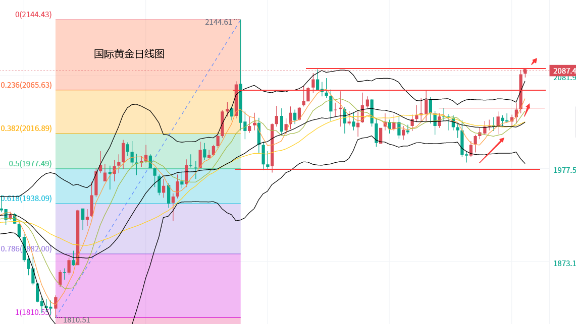 上周五黄金震荡上涨,表现相当强势。美盘开盘前,金价短线回踩2038美元,企稳后涨至2057美元遇阻,此后保持2050到2057美元窄幅震荡,直到美盘盘中(当晚11点),短线回踩2045美元,企稳后逐渐走强,不到3小时上涨超过40美元,最高涨至2088美元遇阻,此后保持2079到2086美元区间横盘震荡,目前(周一)交投于2085美元附近。