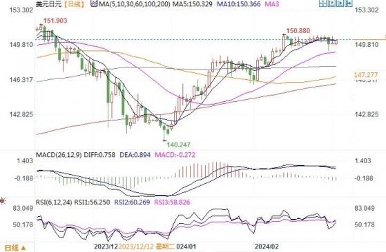 周五(3月1日),美元指数下跌0.23% 至103.87,然而日则因日本央行谨慎态度而走低,美元/日元尾盘上涨0.09%,报150.10日元。周五当天公布的2月份美国制造业进一步下滑,衡量工厂就业情况的指标降至七个月低点,新订单减少。原本预计会增加的建筑支出在1月份也出现下降。数据公布后,高盛的经济学家将第一季度的国内生产总值(GDP)预期下调了0.2个百分点,降至2.2%。美元指数因此受挫,但美元在很大程度上仍处于区间震荡,交易商还在密切关注经济数据的进一步发展,以寻找美联储何时可能开始降息的新线索。周五当天,日本央行总裁植田和男表示,现在断定通胀率接近持续达到央行2%的通胀目标还为时过早,并强调有必要仔细研究更多有关工资前景的数据。通胀预期和日本央行的政策路径可能将取决于大型企业与工会就加薪问题进行的谈判。工资谈判将带来更多表明日本的通胀正变得更加持久的信号,那么市场预计日本央行将退出负利率政策。日本央行总裁周五稍显谨慎的表态,略微抑制了日元的表现。日线图上,美元/日元似乎存在尝试下穿布林带通道中轨线的倾向,各项技术指标也呈现开始下摆的倾向。若美元/日元近期收盘于150之下,那么日元存在着逆转跌势转而为升的走势。目前上方151的阻力看来不易穿过破。