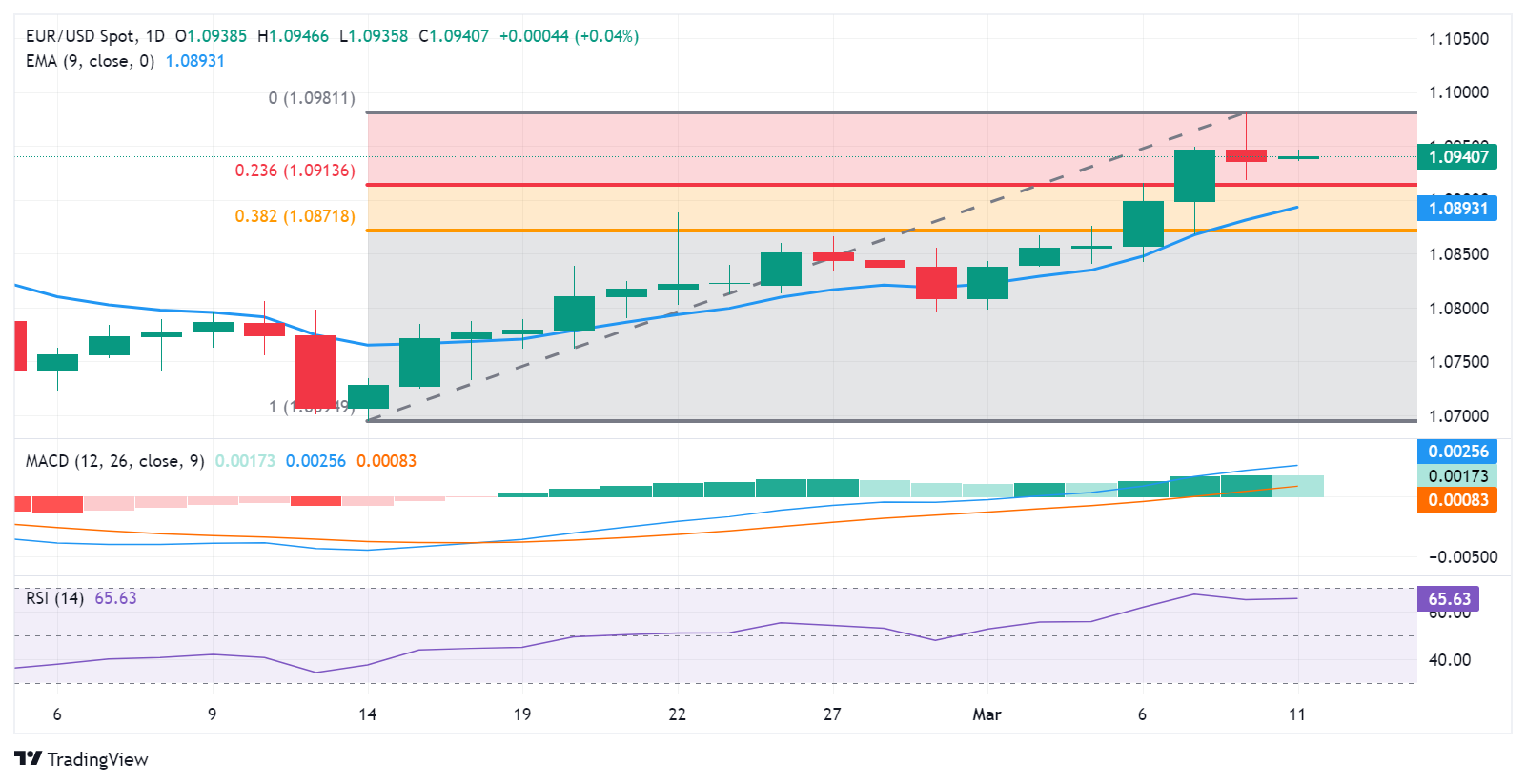 继周五公布乐观的美国非农就业数据后,欧元/美元在美元稳定的情况下呈现横盘走势。周一亚洲交易时段,该货币对徘徊于1.0940附近,直接阻力位为1.0950,随后触及前一交易日的八周高点1.0981。