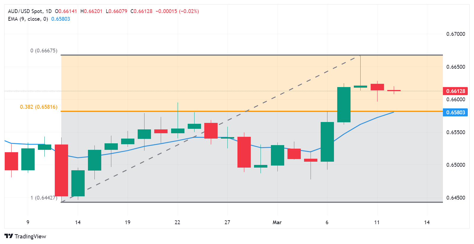 美元指数(DXY)保持稳定,巩固涨势,因市场在美国消费者价格指数(CPI)数据公布前保持谨慎。尽管年度指数预计将保持不变,但预计 2 月份环比将有所上升。强于预期的消费者物价指数报告可能会削弱美联储近期降息的希望。这可能会提振美元,从而可能给澳元/美元货币对带来阻力。