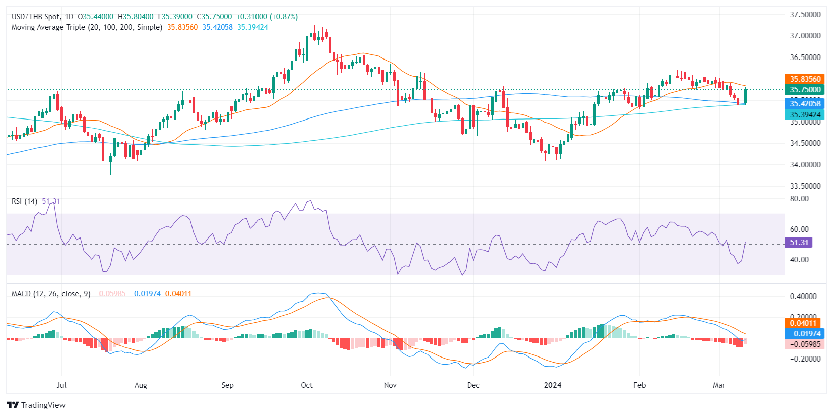 日线图上,美元/泰铢货币对显示相对强弱指数 (RSI) 周二跃升至 50 以上,表明多头正在复苏。然而,这种积极的前景受到移动平均收敛分歧 (MACD) 柱状图的红色条的影响,尽管红色条较短,但表明仍然存在抛售势头的迹象。