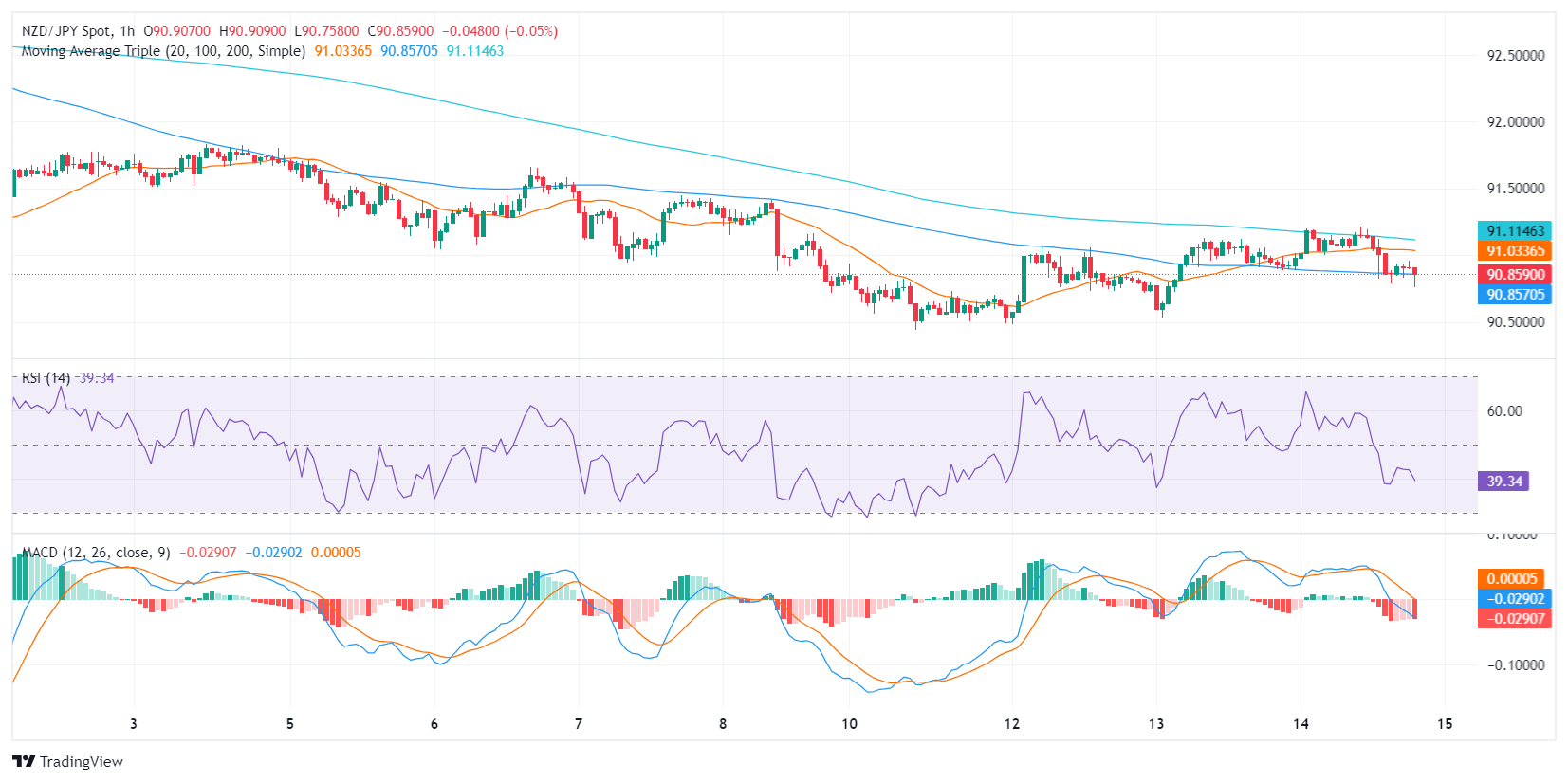 周四交易时段,纽元/日元汇率小幅下跌,在触及高点 91.21 后目前定于 90.79。短期内,抛售主导了市场格局,买家未能聚集更多动力。