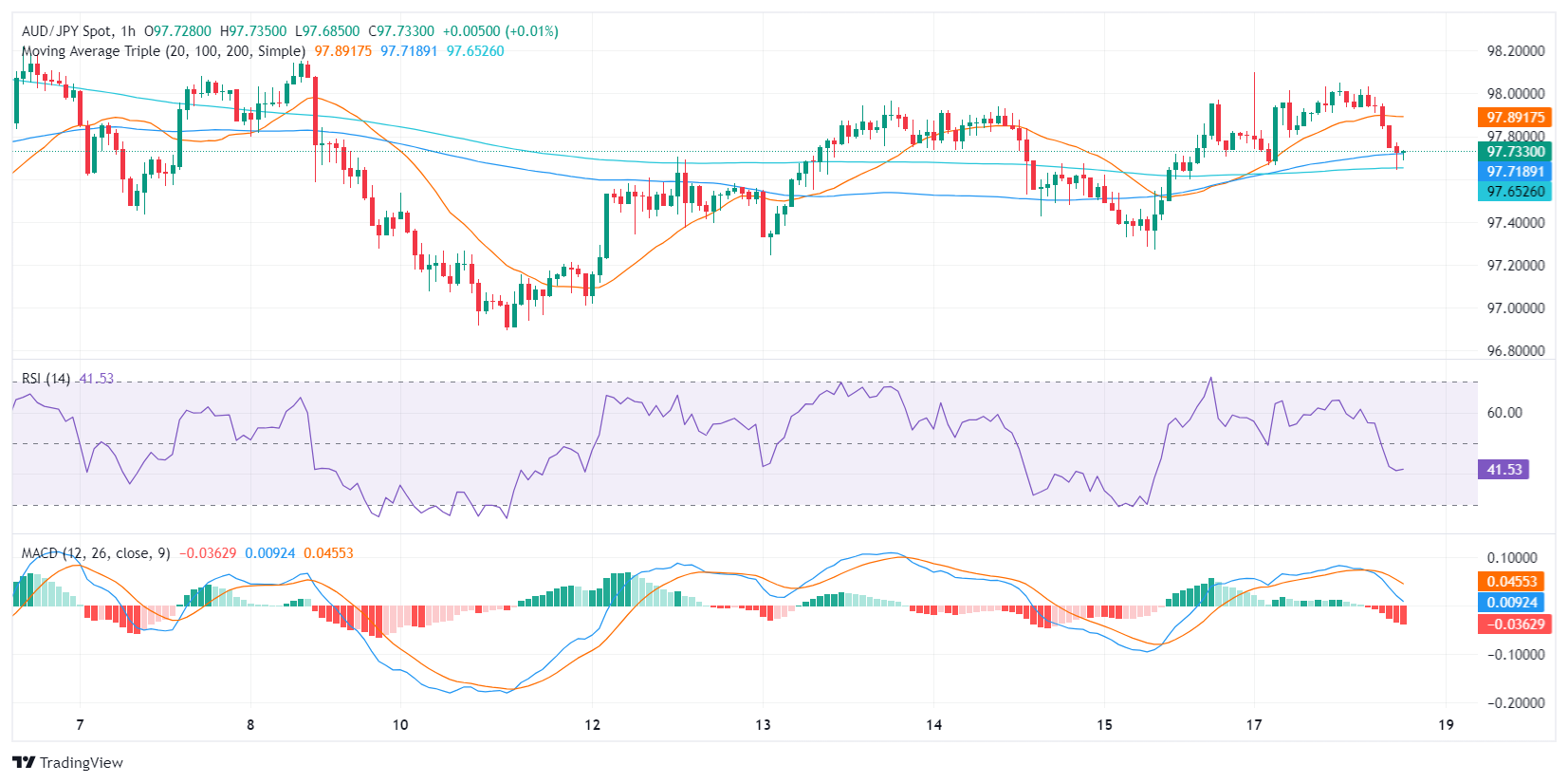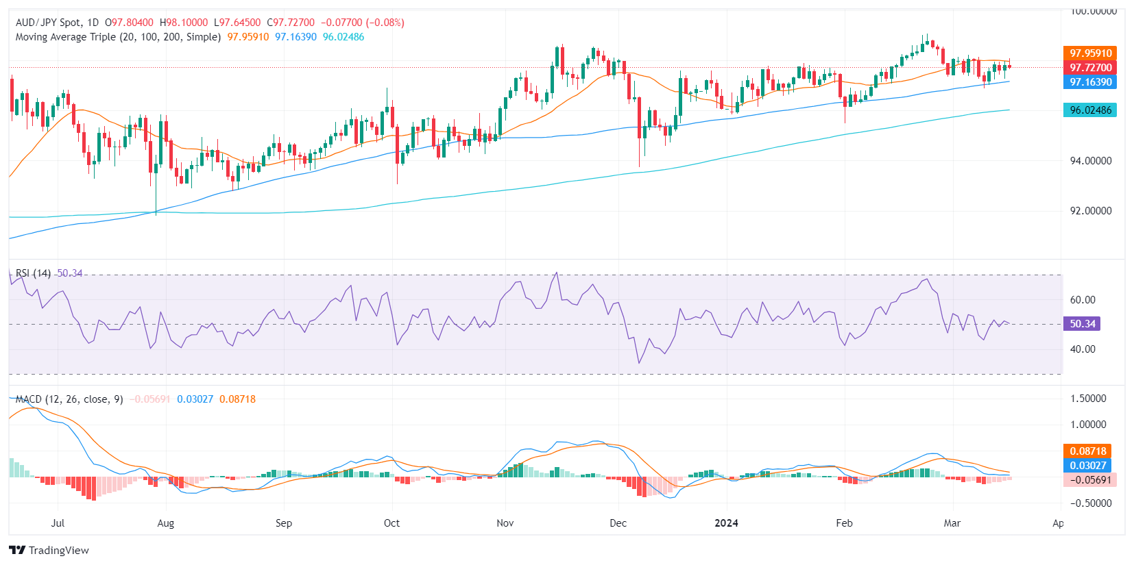 周一交易时段,澳元/日元交易价格为 97.71,在触及 98.10 附近高点(接近 20 日简单移动平均线)后小幅下跌。除非买家攻克这一水平,否则任何上行尝试都将受到限制,短期前景将向有利于买家的方向倾斜。