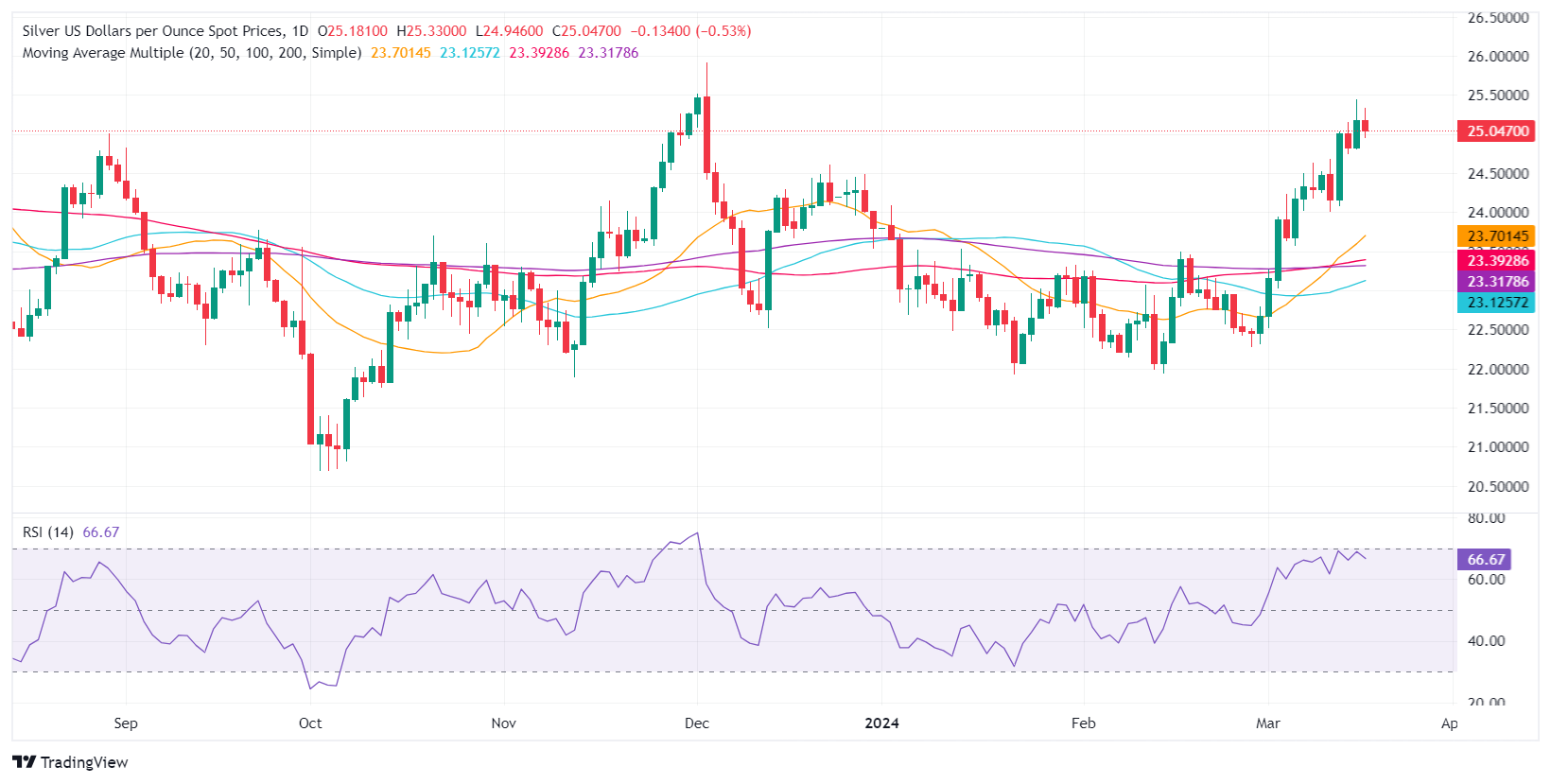 由于美国国债收益率在联邦公开市场委员会 (FOMC) 会议之前上涨,周一白银价格跌至每金衡盎司 25.00 美元。美国10年期国债收益率上涨支撑了美元,这对贵金属来说是一个阻力。因此,XAG/USD 交易价格约为 25.03 美元,截至撰写本文时下跌 0.57%。