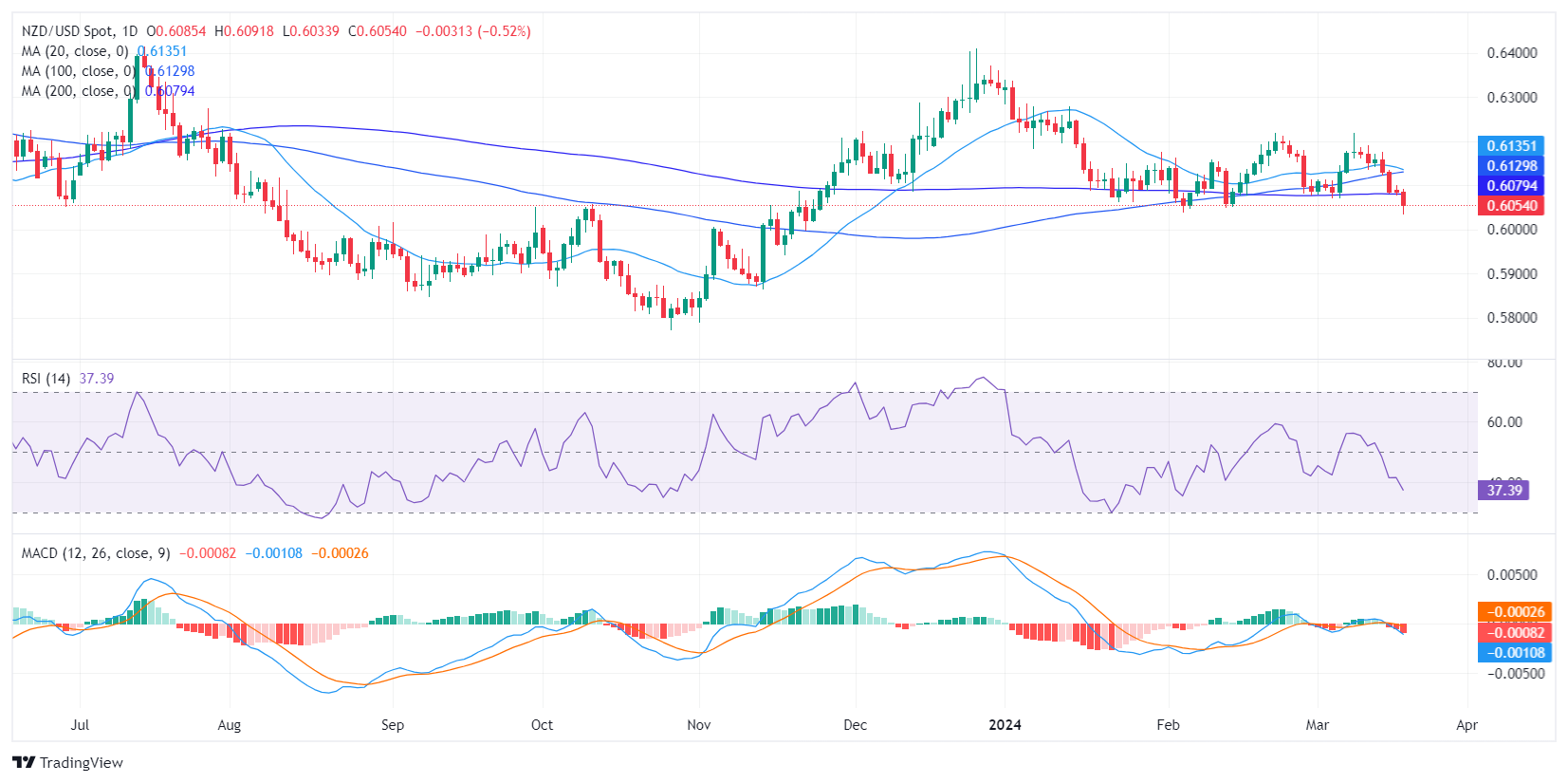 摘要:纽元/美元日线图呈现看跌前景,RSI 和 MACD 均位于红色区域。