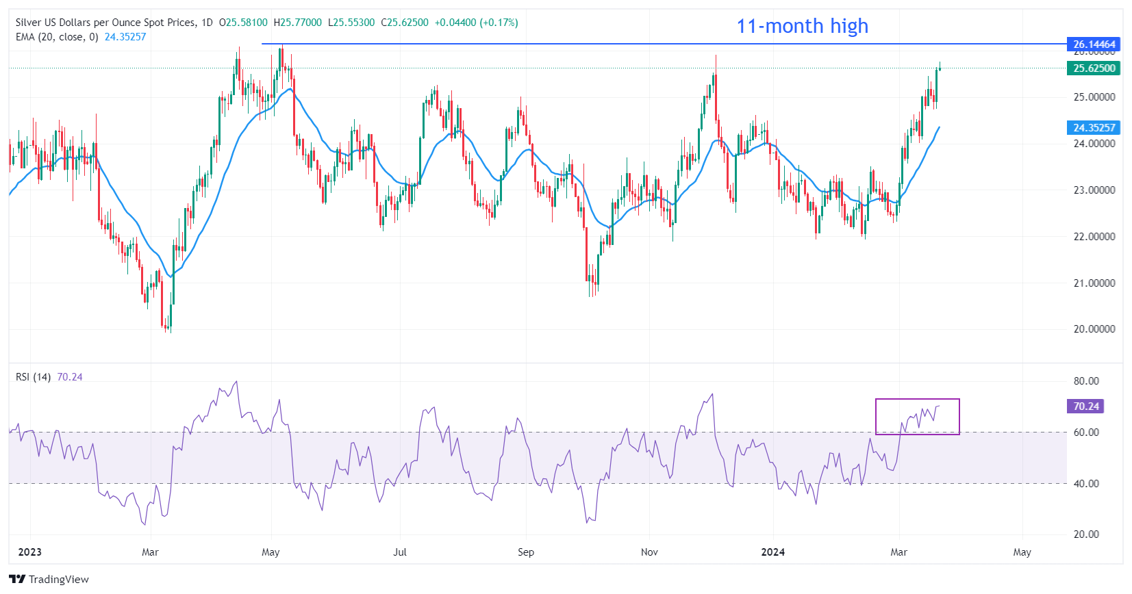 白银价格逼近 11 个月高点 26.14 美元。由于 20 日指数移动平均线 (EMA) 位于 24.35 美元,近期需求看涨。14 周期相对强弱指数 (RSI) 在 60.00-80.00 的看涨区间内振荡,表明势头倾向于上行。由于动量振荡器仍远未达到超买,看涨势头仍未减弱。