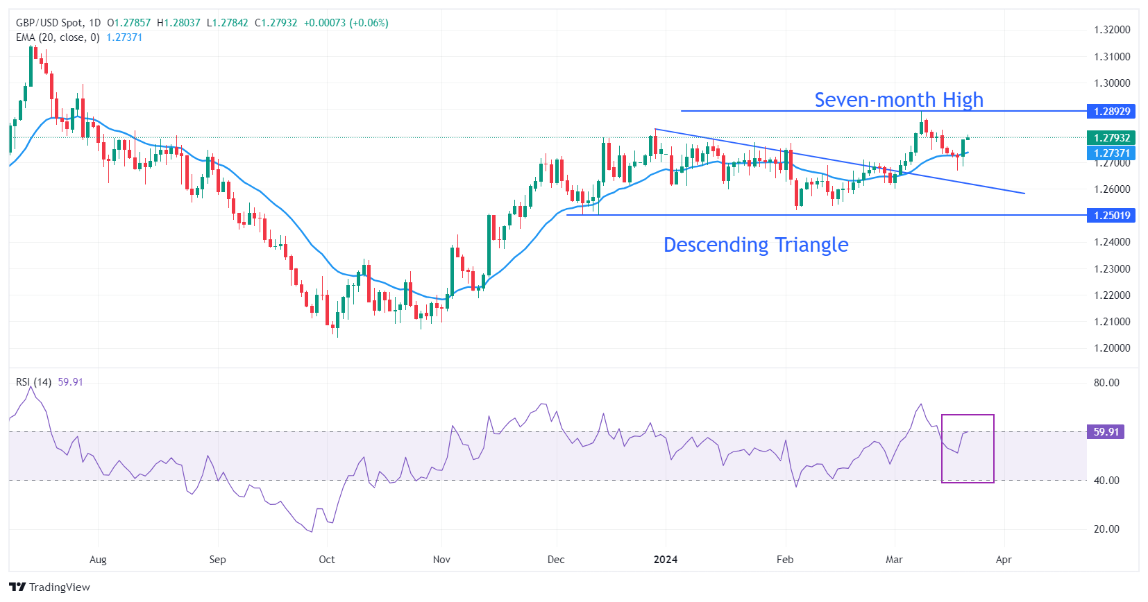 由于风险偏好情绪,英镑飙升至整数阻力位1.2800。在发现 1.2700 附近形成的下降三角形突破区域附近的买盘兴趣后,英镑/美元汇率强劲反弹。英镑/美元货币对反弹至 20 日指数移动平均线 (EMA)(交易于 1.2740 附近)上方,近期需求转为看涨。