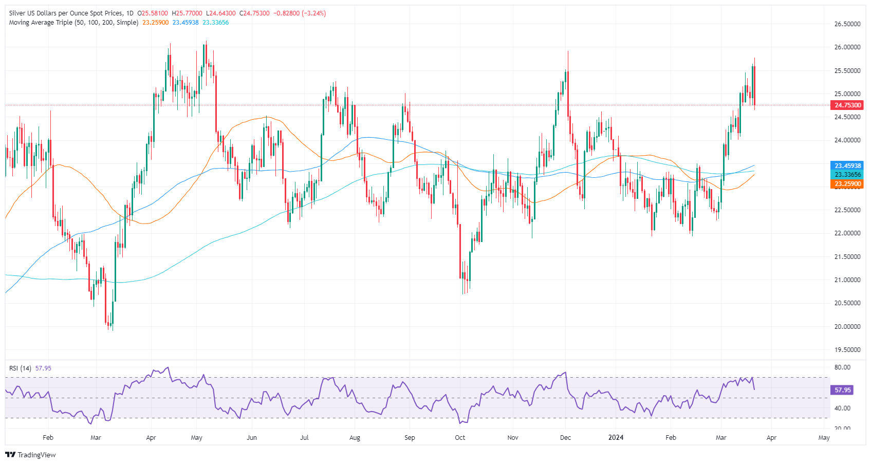 周四,在避险情绪的推动下,白银价格暴跌,重振了美元走势。因此,灰色金属下跌超过 0.70 美元,即 3.15%,XAG/美元在触及 25.77 美元的日高后,交易价格为 24.75 美元。