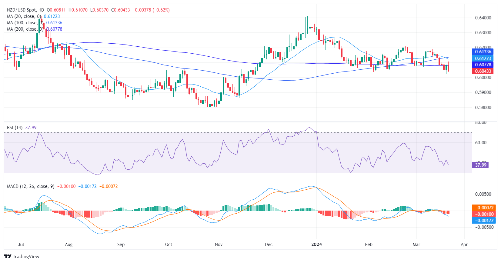 比较每日和每小时图表后,两个时间范围内都明显出现一致的负面趋势。RSI 和 MACD 指标表明新西兰元/美元货币对继续由卖家主导。从更大的背景来看,该货币对跌破 20、100 和 200 日简单移动平均线 (SMA),为日线和小时图表中描绘的负面趋势提供了更多证据。