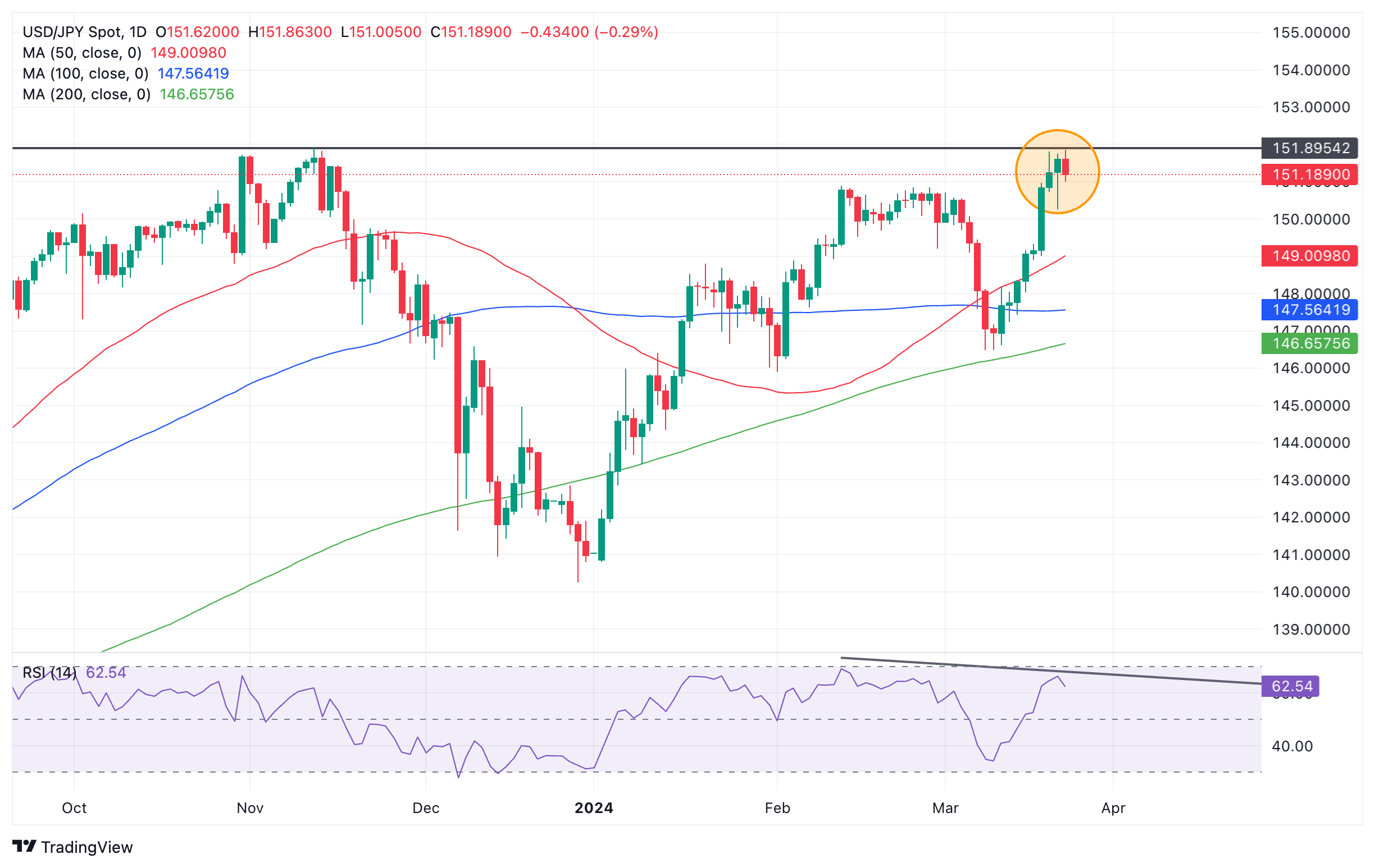 周五,美元/日元在关键图表高点 151.000 处形成了看跌的吊人日本烛台图案(圆圈),表明短期反转和回调的风险加大。