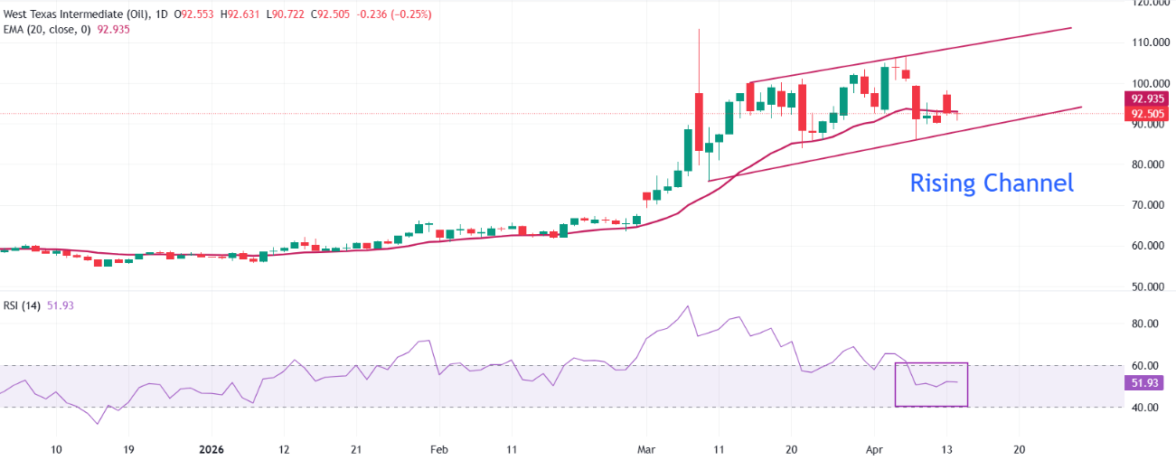 价格仍保持在20日指数移动平均线(EMA)92.94美元上方,并受到一条在89.50美元附近最近得到验证的上升支撑线支撑,这共同表明整体的上涨趋势目前仅处于盘整阶段。