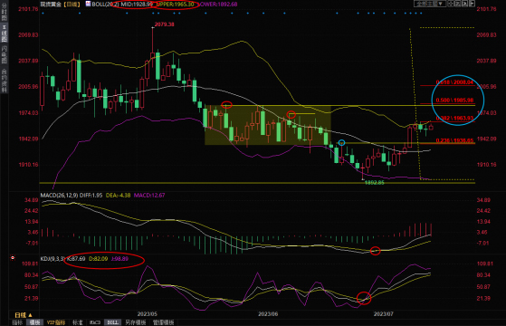 不过,KDJ已经发出短线超买信号,金价目前还受到38.2%回撤位1963.93和布林线上轨等多重阻力压制,在顶破1963.93前,仍需提防震荡回落风险,初步支撑参考1950关口,隔夜低点支撑在1945.67附近,进一步支撑参考6月23日高点1937.10附近位置,该位置也接近23.6%回撤位,布林线中轨支撑在1928.97附近,若失守该支撑,则增加后市看空信号。相对而言,在失守10日均线前,后市整体偏向多头。
