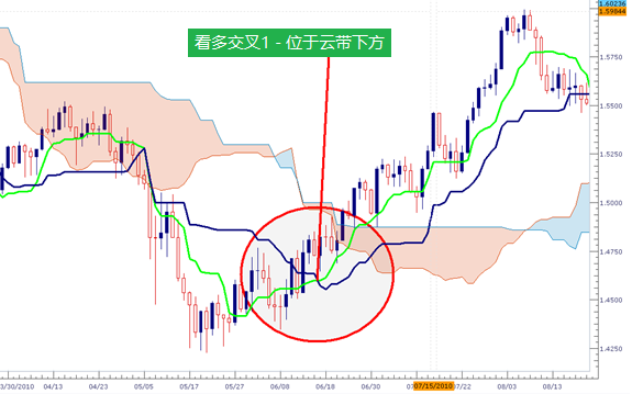 当两线在云带下方交叉时,之前的看空趋势正临近尾声。而交易者们也不能确定该趋势是否会逆转,还是会继续下去。因此,交易者们通常会将云带下方的看多交叉看作为较弱的信号。但如果趋势真的逆转了,潜在的盈利也可能会非常可观,不过没有人可以保证趋势真的会逆转。所以,在交易这类较弱信号时,交易者们需要时刻关注风险,并设置好止损。