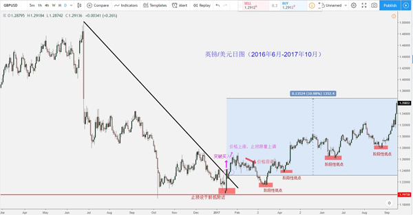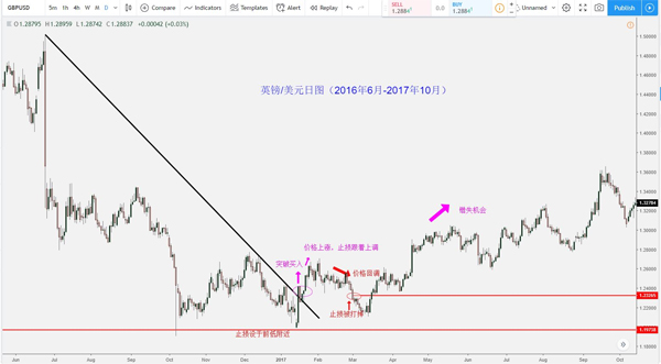 通常交易者会将止损点设於阶段性的高点或低点附近(取决於是做多还是做空),但移动止损最明显的缺陷就是增加了价格回调时止损被打掉的概率。为了避免错失交易良机,交易者可以尝试手动调整止损位置,将止损设置在一些重要的关键点位上。以下图做多英镑/美元为例,交易者在价格形成一个明显的阶段性低点时便手动将止损调至低点附近。如图所示,在止损被打掉之前,这笔交易一共迎来了逾1350个点的盈利。