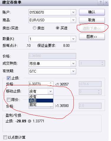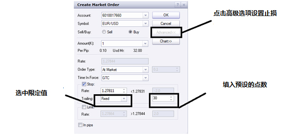 在交易平台可以轻松添加移动止损。所有的移动止损都可以通过点击下单指令窗口中的“高级选项/Advanced”按钮进行添加。首先我们要找出设置第一手止损的具体位置,也就是移动止损的起点,即能承受的最大损失。接著,勾选“止损点/Stop”选项,在下拉菜单中选中“限定值/Fixed”;最後,在旁边的空白栏里填入预设的点数(代表只有当价格波动幅度达到该点数後,追踪止损点才会随之移动),便完成了设置。