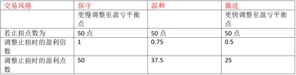 将止损点移至盈亏平衡点的合适时间通常取决於交易员的目标、策略和风格。下表将根据交易员在交易管理上是否采取保守、温和或激进的立场,建议一些相应的调整时间。