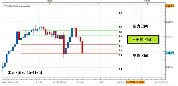 现在我们已经运用枢轴点确定了汇价的支撑和阻力,现在下一步就是寻找交易机会。较好的方法是当汇价触及阻力R3回落的时候卖出,此时还要求30分钟的K线收盘价依然在枢轴区间之内;或者当汇价触及支撑S3的时候买入,30分钟的K线收盘价也要在枢轴区间之内。将烛图和日内枢轴点配合,交易者就可以得心应手的寻找入场时机。