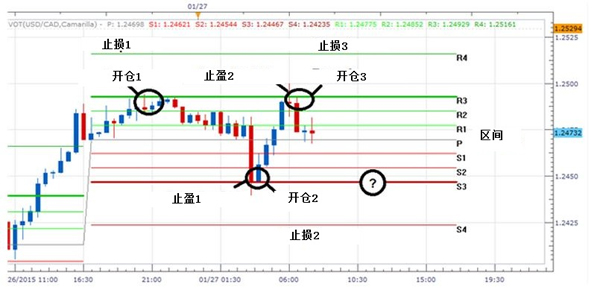 如上图所示,开仓1就是汇价上探R3阻力而且K线仍然位於枢轴区间之内,此时可以开仓卖出,止盈1设置於S3的支撑附近;汇价下探S3的支撑,开仓1就可以盈利,同时K线位於枢轴区间之内就可以执行买入开仓2,止盈2设置在阻力R3附近;当汇价再度上探触及R3的阻力的时候,开仓2就可以盈利,同时K线仍然位於枢轴区间之内,再度开仓3卖出,并继续执行该计划。