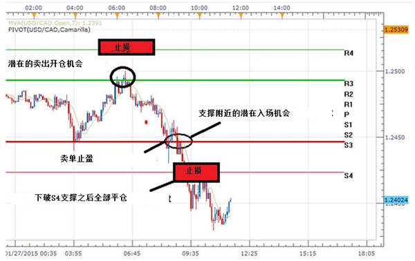 从止盈的角度来看,如果交易者在R3附近卖出,止盈应该设置於S3附近;在S3附近买入,止盈应该设置於R3附近。使用枢轴点确认支撑和阻力,交易者就可以很容易的使用日内枢轴点交易策略,与此同时,尽量使得仓位的风险回报比都符合1:2。