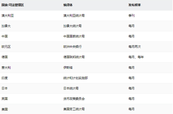 下表显示了一些主要经济体及其 CPI 发布的信息。