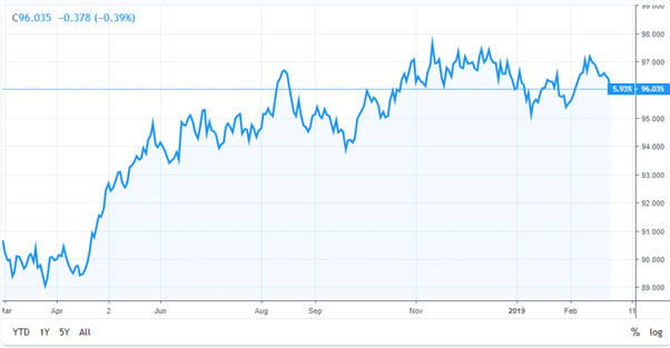 解读 CPI 数据影响的一种方法是监控美元指数,下面是 2018/19 年的示例图表。如果CPI的释放超出预期,我们有理由相信这可能成为推动该指数创出新高或从阻力位反弹的催化剂。
