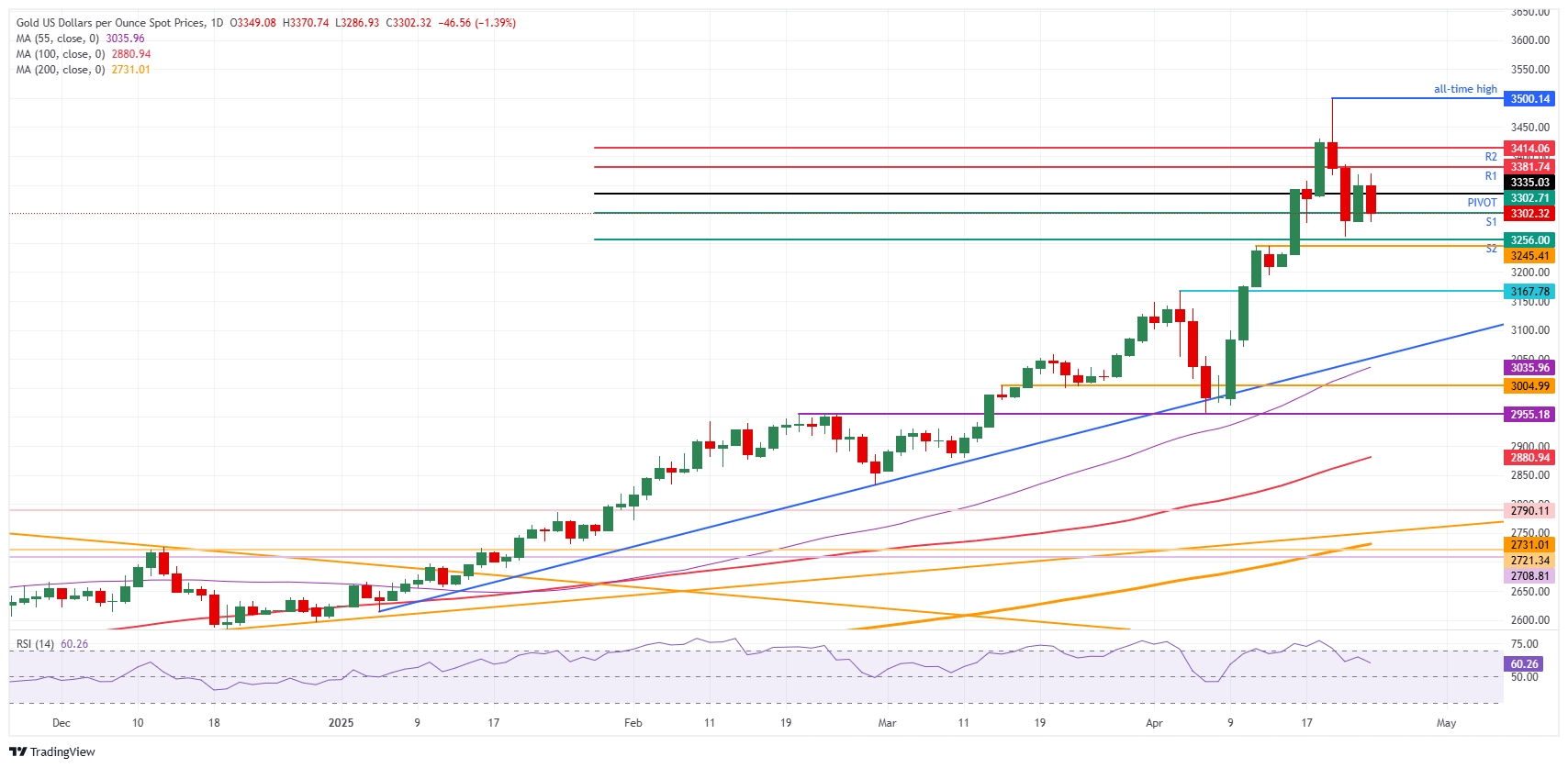 缺点是,S1 支撑在今早短暂被突破,不过现在看到价格行为正在反转回到其上方,即 3,302 美元。再往下方,S2 支撑在 3,256 美元,接着是接近 3,245 美元的技术关键支撑(4 月 11 日高点)。